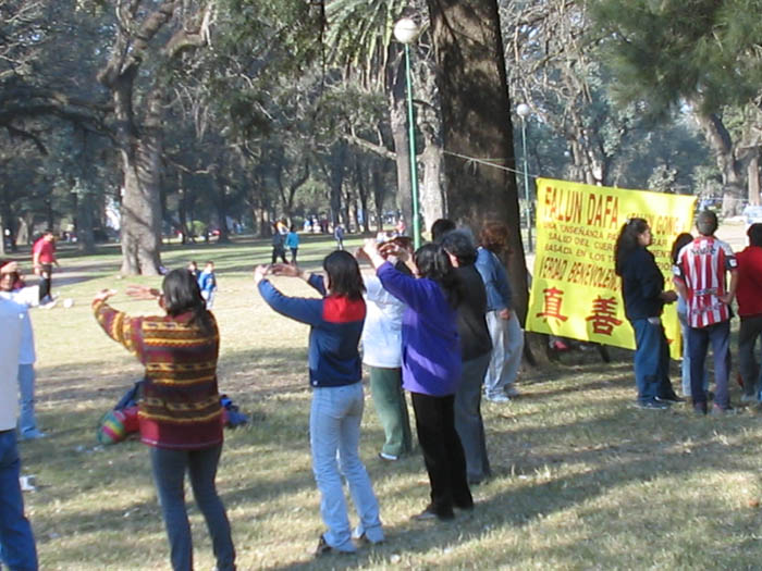 有一位同修家住在阿根廷邻近南极最南方的省。他一个人从网上下载了炼功音乐、大法书籍,一个人独修。结果为了上大学,到了Tucuman省,在大学碰到了一位女同学。她也自己在修炼法轮功。现在两个人周末在公园成立了炼功点,并且安排大家在一起学法。每个人都很想做好,想知道他们在他们那种环境中如何能洪传大法,讲清真相等。我们从首都带去两套师父法像,法轮图。只能分给两省的学员。得到的都太高兴了。没有的非常失望。因为参加国外法会的机会太难,大家最大的希望是有一天他们也能见到师父。