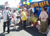 8月24日星期天,一位老先生一大早就来到我们的摊位拿材料并主动签名。学员们的功法示范也吸引了不少游人驻足观看。他们说:“看,他们真祥和。”有的人还当场要求学功。