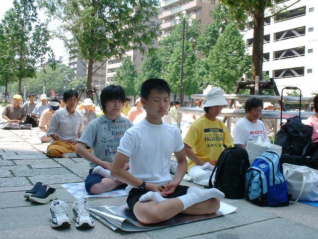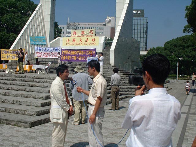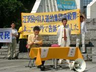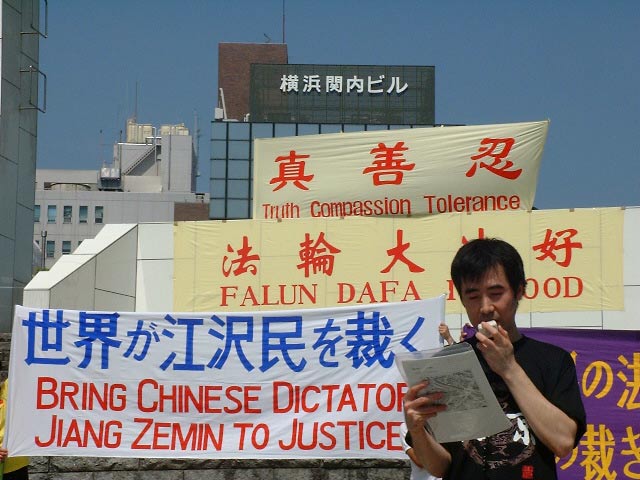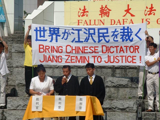 上午10点,来自日本各地的大法弟子在大道公园集体炼功,发正念。下午一点半集会开始。首先发言的是大赦国际日本支部的代表。他讲述了在中国大陆法轮功及其他的一些人权遭侵害的案例。之后模拟法庭开庭。模拟法庭的背景悬挂着“全球公审江泽民”,“江泽民以群体灭绝罪在海外被起诉”,“全世界法轮功弟子建立审判江泽民的正义之场”,“中国停止法轮功”等中日文横幅。扮演法官的大法弟子身着黑袍,正襟危坐,表情庄严肃穆。公诉人历数了江泽民的罪状后,三名法轮功弟子作为受害人出庭作证。一位大法弟子因在天安门广场打“法正乾坤”横幅,遭恶警殴打,被遣送回原籍,并被非法判劳教。遭三个月非法监禁后,在家人被勒索了2万元后才得以释放。他控诉江XX说,监禁,判决,暴行,罚款都是完全没有法律依据,未经任何司法手续。日本大法弟子田中裕子讲述了她的哥哥及一些大法弟子在吉林省九台饮马河劳教所所遭受的迫害;还有一位大法弟子吴丽丽出示了她姐姐吴晓华遭受残酷迫害的证据,揭露了在劳教所遭到野蛮灌食,被穿上约束衣等折磨,并受到人格侮辱,被迫害得生命垂危的事实。