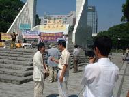 今天可能是今年多雨低温的夏季少有的炎热的一天,气温大约达三十五度,在整个模拟审判过程中,大法弟子们头顶烈日,坐在滚烫的石板地上静静地发正念,过往的行人、汽车也停下脚步,关注着这异乎寻常的一幕。