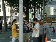 模拟审判结束后,大家手举着“日本大法弟子要求审判江泽民”,“法轮大法”,“真善忍”,“中国停止迫害法轮功”,“呼吁尽快救出金子容子”等横幅,开始由大道公园出发,进行和平游行,游行队伍绕横滨中华街一周,途经中区政府,横滨市政府和旅游点山下公园。路人都注视着,并接过大法弟子递上的大法真相资料认真阅读。尽管天气炎热,大家都秩序井然,精神饱满地行进。游行持续了近一个半小时后,下午五点圆满结束。