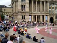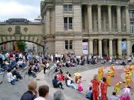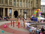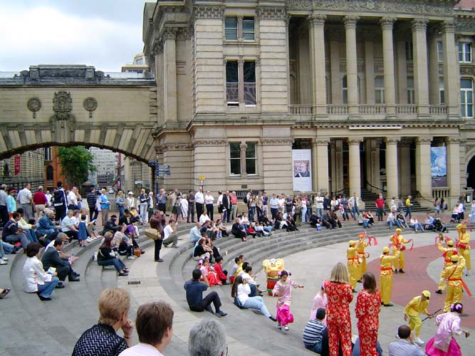 下午三点左右,参加演出的学员有一部份游行到闹市区演出,他们表演了舞狮、震天腰鼓,以及由乐曲“法轮大法好”改编的“飞天莲花舞”,并进行了功法表演。很快,过往的行人就将他们围得水泄不通,足有四层围观群众。每一个表演完后,都报以热烈的掌声。当学员们表演功法时,他们也静静地观看,当接到真相传单时,还询问本地的炼功点在哪里,希望去学功。