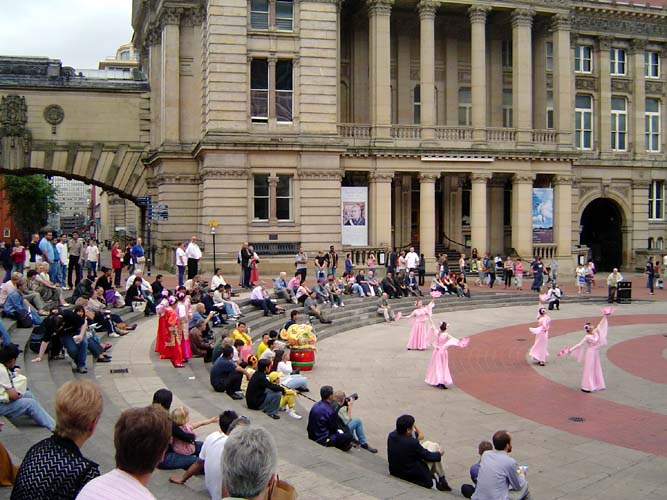 广场周围环绕着阶梯,就像一个小型的露天体育场。许多过往的行人坐下来津津有味地观看演出,每个节目结束时,观众们都会以热烈的掌声表示他们的谢意。这些节目大部份都非常具有中国的民族特色,例如:舞狮、震天腰鼓等。除此之外,有四位学员演出的“莲花舞”也特别抢眼,一位来自最大的本地报社记者为她们拍照后,还对她们进行了简短的采访。