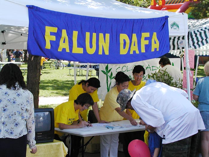 【明慧网2003年8月30日】八月十六日,科罗拉多州的大法弟子,参加了在夫特-考林(FORT COLLINS)举办的一年一次的“新西部”节,向当地民众介绍法轮大法和讲述法轮功在中国大陆遭受