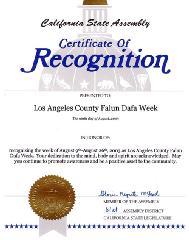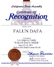加利福尼亚州众议院褒奖证书颁给:洛杉矶县法轮大法周为庆祝2003年8月9日至8月26日洛杉矶县法轮大法周。