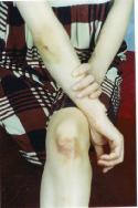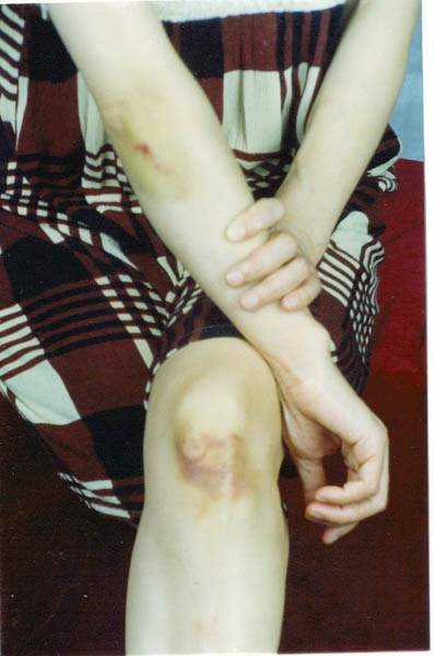 【明慧网2003年8月6日】我叫海伦.刘,澳大利亚公民。2002年7月我回中国探亲,有一天我和我姐姐去天安门广场游玩。我姐姐当时只因在天安门广场伸了伸胳膊就遭到便衣警察的抓捕。警察问她是不是法轮功学员,她说不是,便衣警察依然连拖带拉地将她弄上警车。弄的她满身伤痕。(见照片)