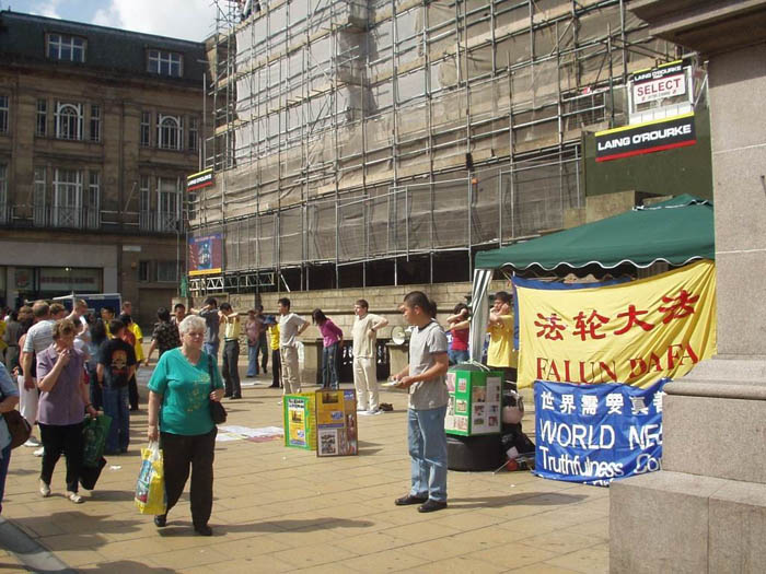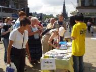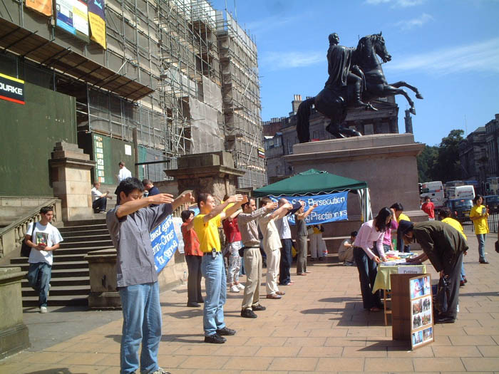 国际艺术节期间的爱丁堡街头,人流如潮,来自世界各国的艺术家们利用各种方式向人们展示着自己心爱的艺术,街头表演更是热闹非凡,而特别引人注目的是王子大街桥头的一群展示中国文化的法轮功人。远远就看见金黄色的法轮大法横幅下,一群修炼人在炼功,发资料和征集签名,签名的人有时都排成了长长的两行。