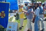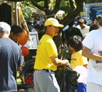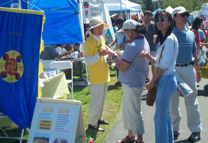 当天,观看表演的路人经常是把我们摊位前的路挤的水泄不通。有的路人说,“你们讲真善忍,XX党讲的都是假的,他们最怕你们讲真了,所以他们要镇压你们。江××死了就好了。”还有的路人说,“法轮功也没做什么不好的事,中国政府干嘛要镇压人家?”有的路人说:“我支持你们,我给你们宣传。”还有人询问炼功点在哪儿。