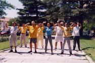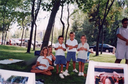 有几个天真可爱的西班牙小孩一直认真的跟随我们学功,他们的父母再三招呼他们回家,他们都不愿离开。一个约三、四岁的小女孩被其父母叫走时,还恋恋不舍地回头看我们。她以孩童特有的纯净的目光注视着一位发传单的学员好一阵,然后又跑过来郑重地伸出小手向学员索取了一张传单,交给她的父母。大法的神圣与庄严,也许这些天真纯洁的孩子们是最能体会的吧。
