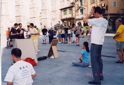 之后我们来到博物馆公园炼功。这里游客络绎不绝。我们把展板摆好,演示功法,以最纯正的心念洪扬大法,这里是塞格维亚的著名旅游景点,游人非常多,选择这里就是为了让更多的人有机会认识大法。
