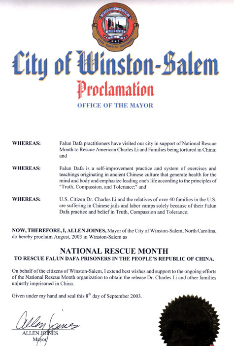 【明慧网2003年9月10日】美国北卡州温斯顿-萨兰姆市市长温斯顿-萨兰姆(Winston-Salem)于2003年9月8日签署一项褒奖令,为营救在中国遭受迫害的法轮功学员,艾伦-琼斯(Allen Jones)宣布2003年8月为温斯顿-萨兰姆市的全美营救月。并代表温斯顿-萨兰姆市市民,向全国营救月活动的组织者所做出的持续努力表达最美好的祝愿与支持。褒奖令译文如下。