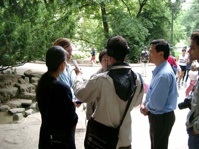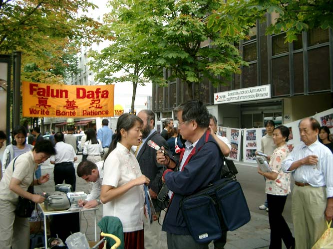 9月7日早上,在戴女士到达法国几天后,很多媒体采访了她。一次,在巴黎一个大公园里的集体炼功的早晨,很多电视记者都来了,并向她提出了一些问题。他们还采访了许多炼功者,并伴同这些炼功人一起度过了整整两个小时。记者们对中国的迫害感到很震惊,并保证做一切他们所能做的来向法国观众解释法轮功修炼者所承受的迫害和诽谤。