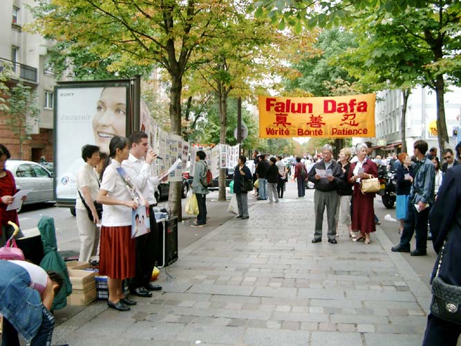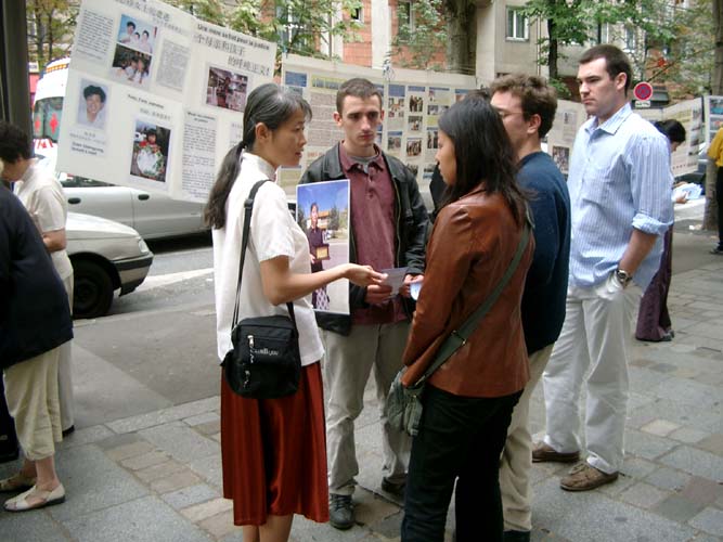 下午,戴女士去了巴黎中国城,在那里,她讲述了她丈夫所遭受的迫害、她起诉江泽民的理由、以及法轮大法的真相。过路的中国人们都很注意,一些人还专心地听了中文,然后又听了法文;许多人还拿了真相材料在他们周围发。
