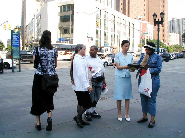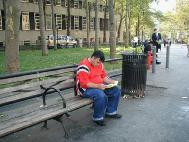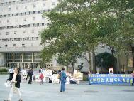 接下来,我们赶往纽约市政府中心11点的另一场新闻发布会。我们还没到,已有记者在等候了。看来“营救李祥春跨美汽车之旅”确实牵动人心。中午时分,人群川流不息,学员们发资料,征集签名,炼功,接待媒体,井然有序。有亲人在国内正被迫害的学员也赶来了并接受了记者采访。行人们看展板,拿资料,要求签名,络绎不绝。NBC电视台,美国之音,纽约日报曼哈顿市办公室派来了又一位记者,布鲁克林大学也有学生记者前来采访。