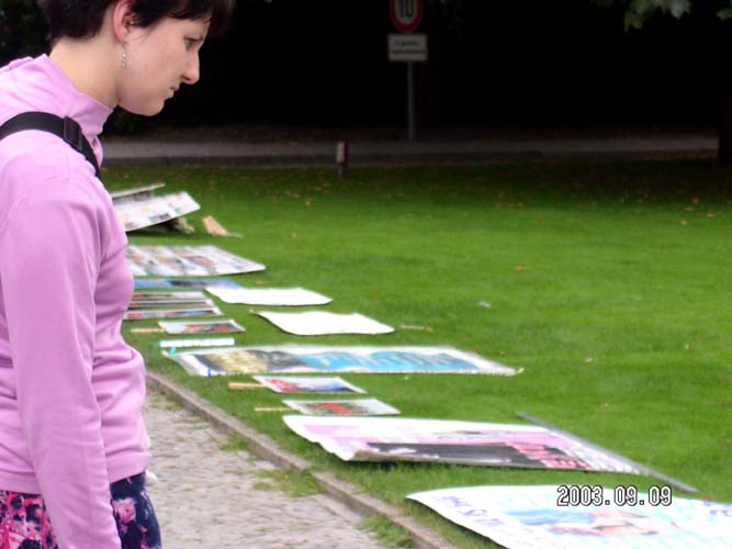 江××群体灭绝罪曝光图片展结束,收拾完毕现场的一切用品时已经过了6点,这时总统府内突然来了一个主管内政事务官员,他兴奋地告诉我们:德国总统劳先生的飞机刚刚起飞了,他会在中国南京大学专门就人权问题发表演讲的。你们放心,一定会强调人权问题的。我是看了你们的那两幅标语才决定专程来告诉你们的。