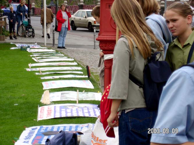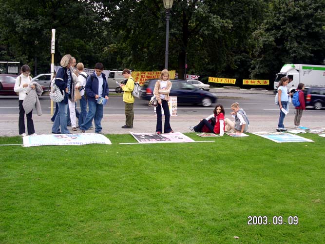 那两幅大型标语是用英语和德语制成的:“紧急呼吁各国政府和媒体立即制止中国国家恐怖主义对法轮功学员的迫害。”