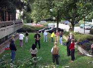 | 当地几位学员在法轮功展台边和参观者谈话 | 展厅外草地上义务教功吸引了不少人参加 |