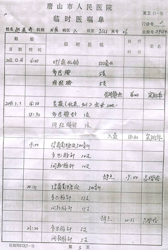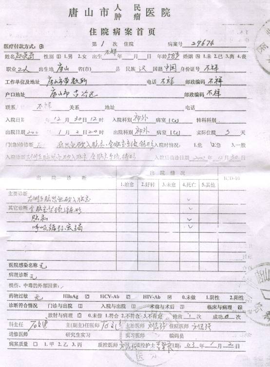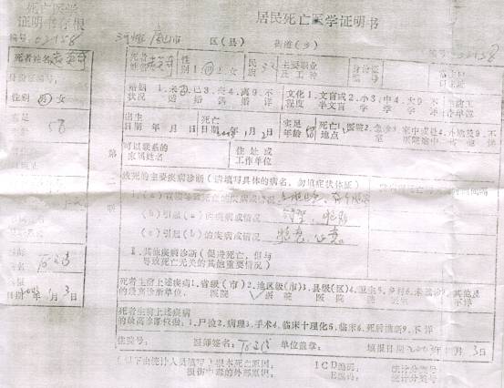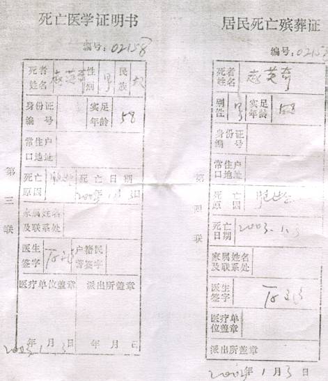 赵英奇在2002年12月30日送去医院当天已经死亡,大夫两次通知送太平间,因家属意见不统一没送,结果死亡通知书上却写2003年1月2日晚8点零二分死亡。赵英奇被迫害致死的消息在明慧网上发表后,劳教所所长王勇敬带一干恶警找到其家人进行威逼、恐吓,真是打死人还不许说,置国法于不顾。