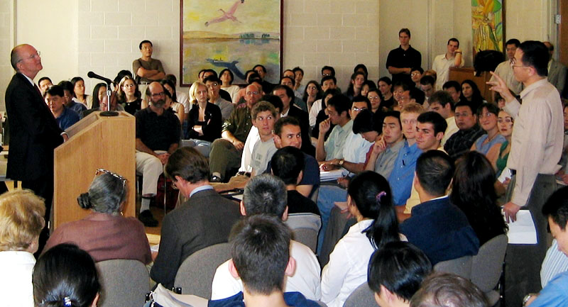 雷德大使解答了美国公民在中国应享受的权利。讲座结束后,在场的一位中国学生特地找到这位法轮功学员,为他到中国旅游受到的不公正待遇表示歉意,并说:“中国的法制真的是糟糕,好在你是美国公民,他们不会对你如何。它还镇压很多信仰,比如法轮功,真是不应该。我希望我们能有能力回去改变这种状况。”