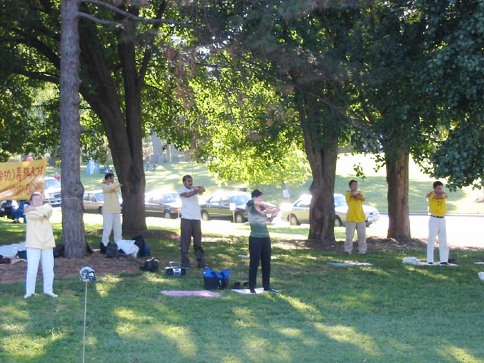 人们纷纷驻足观看学员炼功和真相展板,不少人已经知道了这场发生在中国的、对成千上万法轮功修炼者的残酷迫害,特别是美国公民李祥春医生至今被关押在中国监狱,使他们意识到这场对人性的践踏就发生在自己身边,他们主动在征签簿上签名;也有的看了大法真相资料后自己走到我们的小桌前签名;也有的游客拿起相机拍下学员们炼功的场景;有的长时间坐着观看学员炼功,有的过来了解炼功点表示要来学功。一位年轻的母亲指着炼功学员对孩子说:“看,多么漂亮。”