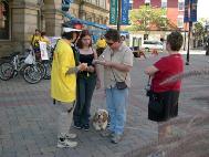 在那坡尼市,当学员在市政府前炼功时,一群10来岁的小孩在周围静静地观察和欣赏优美的功法。这时,一个成年人过来有意挑衅,小孩们马上围过来对学员表示支持。其中一个说,我看了你们的展板,64岁的老人因炼功被关押,这太令人气愤了。