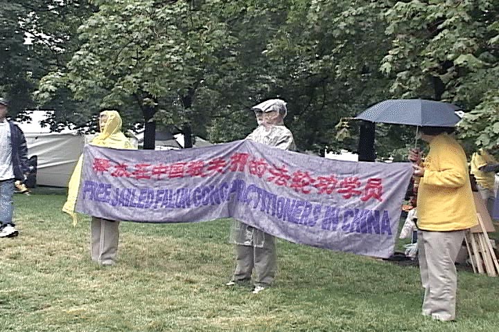 | 第二电视台记者访问符泳青 | 从加州一路参与的西人弟子 | 在雨中持横幅的弟子 |