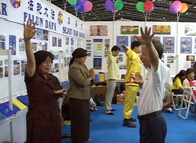 | 展观的人们要买炼功的CD回家炼 | 印尼的官员要买《转法轮》 | 看见炼功,就当场要学 |
