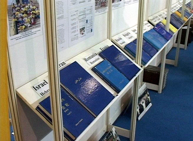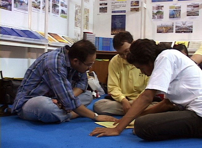 | 展出翻译成各国文字的法轮大法著作约三十多个版本 | 想知道法轮功多一些,干脆坐下来问。 | 小弟子在演示功法。 |