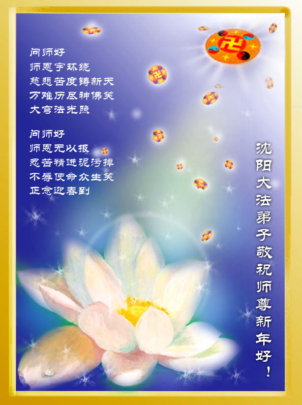 敬爱的师父:您好,在新年到来之际,我们流离失所的大法弟子向慈悲伟大的师父深深地敬贺新年好!弟子们非常想念您!