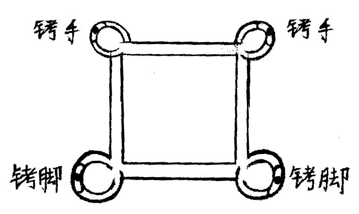 【明慧网2004年1月17日】2000年12月底,被非法关押在金州区看守所的大法弟子集体绝食,抗议恶徒们对大法弟子的的无理。我们不干活,要求无条件释放,这下惊动县局,县公安局范局长到看守所查谁带头绝食,他们把刚从北京绑架回来为法轮功和平上访的两名同修视为重点。这两名同修叫张春花,谭树云。当时来了一帮狱警,有狱医张书全带头,对我们20多名大法弟子大打出手,打人者有张书全、鞠文洋、高迁等恶徒,其它不知姓名。有的恶徒对我们同修拳打脚踢,有的恶徒不停地挥动手中的橡皮板带,狠狠地打在我们同修的脸上、头上。当橡皮板带从脸上抽去时,感觉脸上的皮肉被板带一下撕开了一样,极痛难忍。有的同修被打得眼睛充血,全是红的,什么也看不见。有的脸变了形,鼻青脸肿。有的满身是伤。然后恶警把从北京刚回来的两名同修戴上刑具折磨三天。这种刑具戴上不能躺着,不能吃饭,不能动,就一个姿势。看守所逼大法弟子每天劳动18-20多个小时。打人最狠的是张书全、鞠文洋、高迁,其它不知姓名,指使他们打人的是王文奇副所长。打人的刑具有橡皮板带,还有一种常人刑事犯称为“奔驰”的一种刑具,大约有一尺,方形铁架子,四个角各有一个由厚铁板制作的铐子,上面两个小的是铐手(手铐),下面着地面的两个大的是铐脚(脚铐),如有一个铐子动一动,就会拧着或夹着双手脖子和双脚脖子上的肉皮,极痛难忍。走路时身体弯腰成近90度,撅着屁股,脸朝下,双眼只能看脚前的地面,一步能迈二寸多远,还拧、夹,磨着肉皮非常的痛苦。(见图)