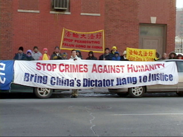 | 芝加哥中领馆前的法轮功学员 | 原告律师在希尔顿旅馆举行记者招待会 |