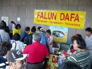 悬挂着“法轮大法”横幅的展位吸引了来往的众人。人们不断地聚集在大法的展位前,有的要学功,有的前来了解有关的最新情况,有的是第一次接触到法轮功。和以往有明显不同的是,越来越多的人们主动地了解和关注法轮功在中国被迫害的情况,不少人想要更详尽、深入地了解关于法轮功,象“见证”、“善”这样的大本刊物很受欢迎,真相光盘也很快被取完。有人不仅给自己拿一份材料,还给他们的亲人和朋友拿一份。