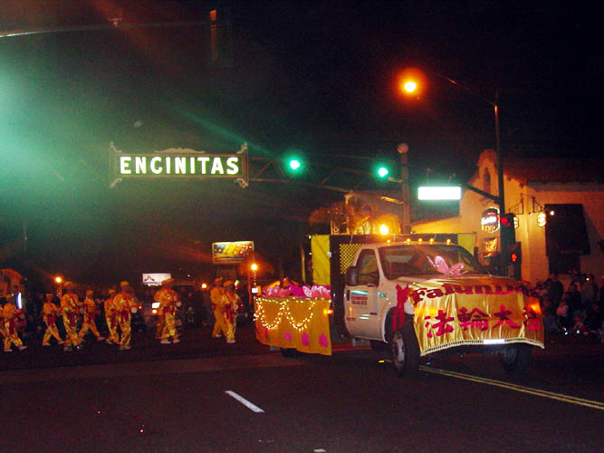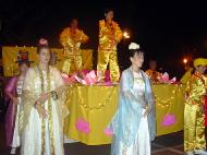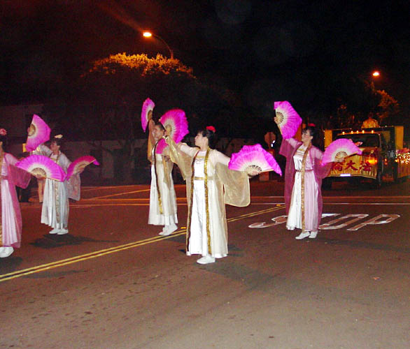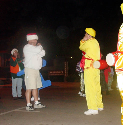 | 游行待发前,学员们伴随着大法音乐炼功,场面慈悲祥和 | 当场学炼法轮功 | 参加晚间节日游行的法轮功学员 |