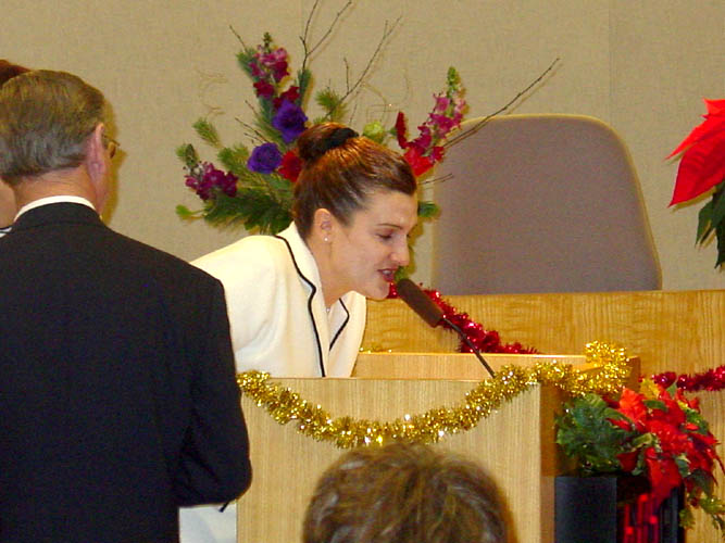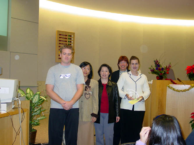 | 参加晚间节日游行的法轮功学员 | 市长Maggie Houlihan 女士亲自颁奖,并同学员代表合影留念 | 学员代表致答谢词并向与会者讲清真象 |