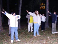 在艺术博物馆旁的草地上,一群独特的人群──法轮功学员们在摇曳的烛光中默默地炼着功,他们微闭双目,表情祥和。吸引着过往的人群纷纷索要资料。