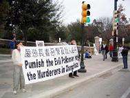 ◇新年前夕之夜,近畿法轮功学员们赶制了有关标语牌及准备了一些悼念用品,前往中国总领事馆,在总领事馆前静坐追悼刘成军,并且强烈要求严惩杀人犯主谋江泽民。