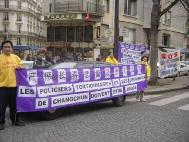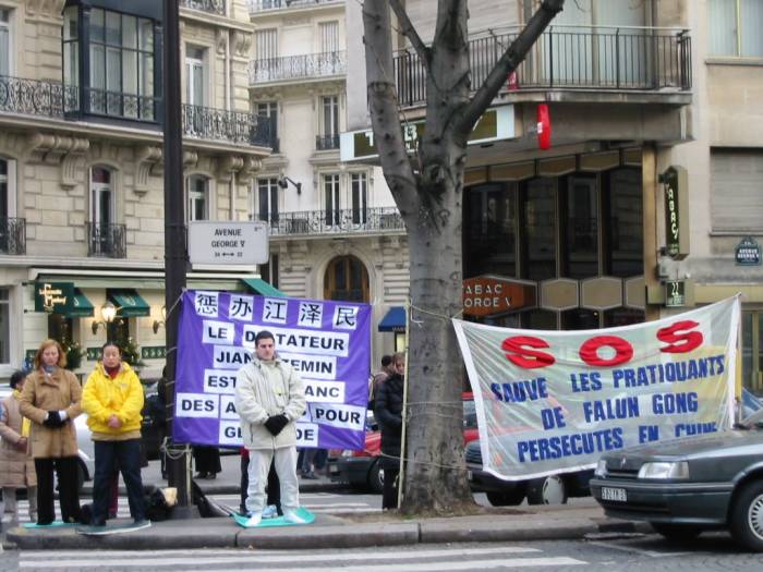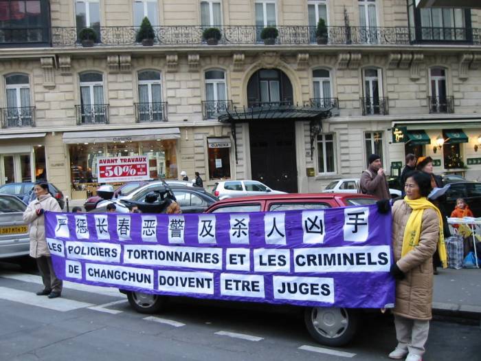 自从江××开始镇压法轮功以来,日本弟子每年在岁末的最后一天,都来到中国驻日本大使馆和平请愿。2003 年12月31日,大家又聚集到使馆前,并悼念12月26日被迫害致死的吉林长春大法弟子刘成军及所有在这场迫害中失去生命的同修。