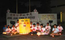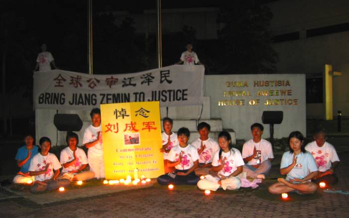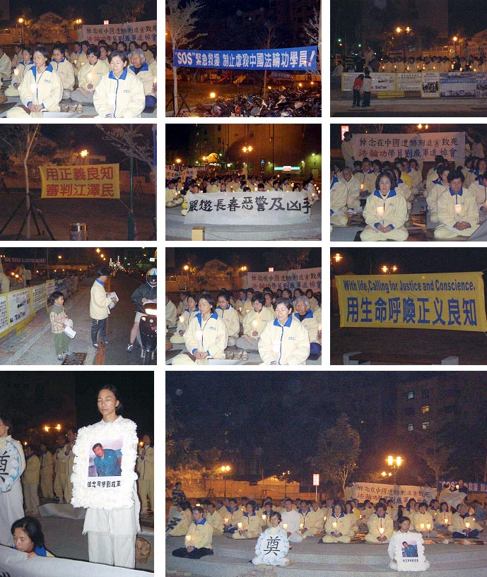 惊闻又一大法弟子──刘成军于12月26日被虐杀致死,台湾台南的法轮功学员们偕同全球营救法轮功学员台湾分会于2004年1月1日在成功大学、火车站及远东百货公司之交界处,举办烛光守夜活动,悼念被虐杀致死的长春大法弟子刘成军。