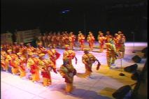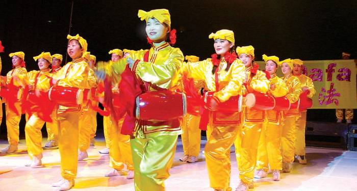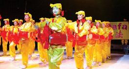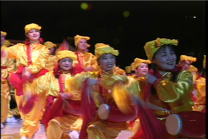 法轮功学员腰鼓队,作为首次应邀参加这样大型庆祝活动的两个华裔表演队之一,给数千名观众带来了精彩的演出。四十八位一身金黄、头系黄头巾、腰扎红绸巾的法轮功学员一上台,便给观众们耳目一新的感觉。表演者精神抖擞,动作整齐利索,鼓声响亮而又欢快,鼓锤上的大红绸子上下飞舞,满台的金黄耀人的双眼。在欢快的乐声中,队形不断地变化着,一会儿是法轮旋转,一会儿是二龙吐水,最后在观众热烈的掌声中,学员们拿著写有“世界需要真善忍”的横幅谢幕。