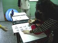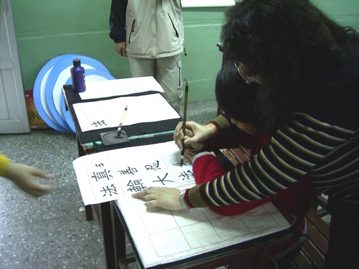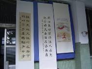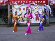 | 大法小弟子的静功演示 | 全体中部明慧师生大合唱:《明慧学校校歌》 | 字画艺术的展示 |