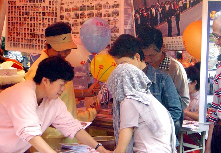 有许多经过法轮功展位的民众在了解了江氏集团迫害法轮功的情况后,马上签名支持全球公审江泽民,也有许多民众想了解法轮大法,很乐意地拿大法简介与VCD.