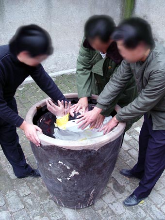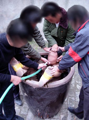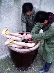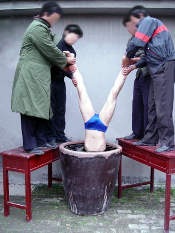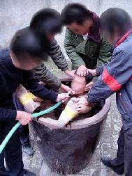 2000年严冬时节,昌乐劳教所恶警为了强制学员“转化”,指使4、5名劳教人员将大法学员扒光衣服(一丝不挂)抬进厕所,把学员的手脚用胶带缠起来放入盛满水的大水缸里,将其头部按进水里灌几分钟,仍不转化,就再按着灌……。