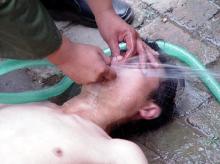 2000年严冬时节,昌乐劳教所恶警为了强制学员“转化”,指使7、8名劳教人员将大法学员扒光衣服(一丝不挂)抬进厕所,把学员按倒在地,4、5个人按着头、胳膊,两个人站在腿上踩着,两个人用水管子喷灌,另有两个人用水桶不停地泼,致使大法学员(姜国波)昏死……。(注:当时是十几个人在洗漱间、厕所内折磨的,因条件所限此图改在露天拍摄)