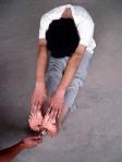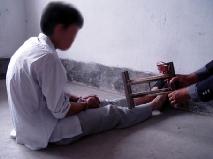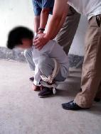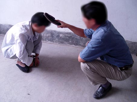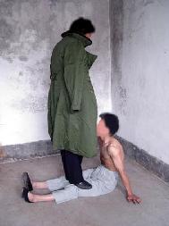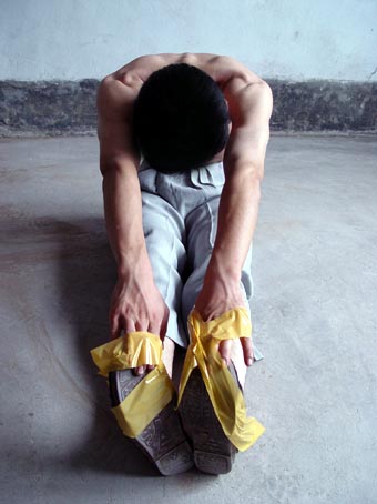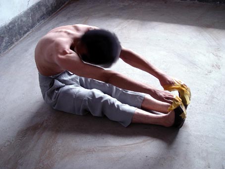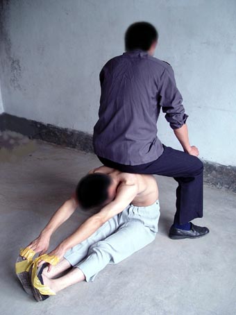 捹脚尖:逼迫学员长期坐在地上伸直双腿,用两手去扳脚尖,捹不住就拳打脚踢,还用胶带将手缠在脚尖上。