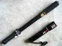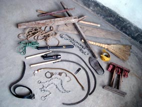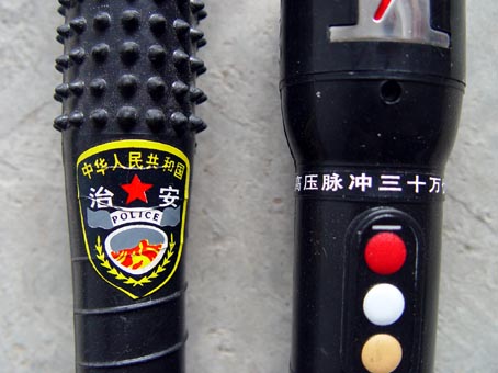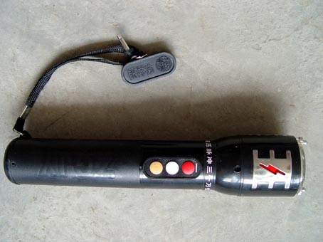 昌乐劳教所摧残折磨大法学员的部分刑具。 |  昌乐劳教所摧残折磨大法学员的刑具――电棍。 |  昌乐劳教所摧残折磨大法学员的刑具――电棍、胶皮棒。 |