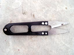 昌乐劳教所摧残折磨大法学员的刑具――电棍、胶皮棒。 |  凶器:铰电线圈用的剪刀 |  用铰电线圈用的剪刀刺划大法学员的脚心。 |