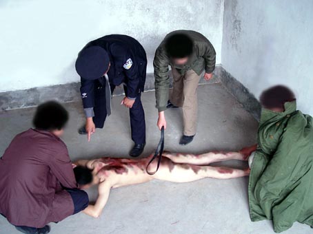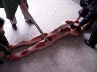用三角带制成的皮鞭将大法学员打得皮开肉绽。 |  用床板毒打大法学员。 |  用床腿、木棍毒打大法学员(刘述春被活活打死) |