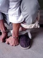 将大法学员戴上手铐,逼迫蹲下后,用毛巾将大小腿固定住,再用一条毛巾将双手拴在脚腕上。这一姿势看似平常,但时间长了疼痛难忍,特别是被恶人摁住僵持此动作时,腿弯处痛得根本无法忍受。有时逼迫大法学员蹲30多天,其间,几乎不允许睡觉,致使有的大法学员面部变成紫黑色(战海港,诸城市人)。