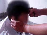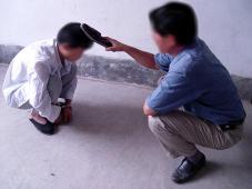 恶人用鞋底拍打大法学员的头顶,不让睡觉。 |  恶人用马扎子击打在大法学员的背部。 |