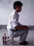 恶人用马扎子击打大法学员的小腿迎风骨。 |  将马札子竖放,逼迫大法学员伸直腰坐在上面,长时间不许动,不许说话。 |